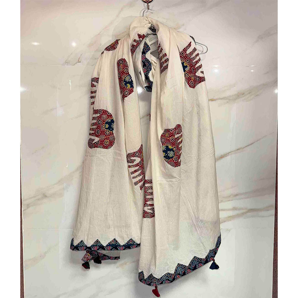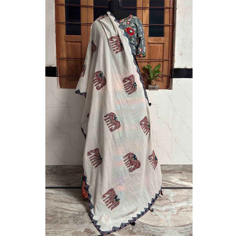 Discover this exquisite applique dupatta featuring majestic hand-stitched elephant motifs on premium off-white cotton. Breathable, lightweight, and artisan-crafted—perfect for ethnic outfits, festivals, or fusion styling. Timeless Barmer heritage!