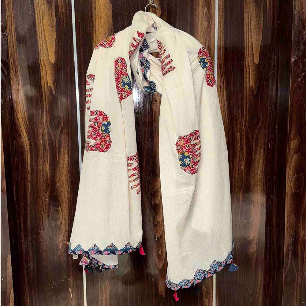 The applique dupatta embodies graceful heritage and modern charm. This premium off-white cotton piece showcases intricate elephant applique motifs, hand-cut and stitched by artisans on high-quality 60×60 thread count fabric for a textured, timeless ethnic accessory.