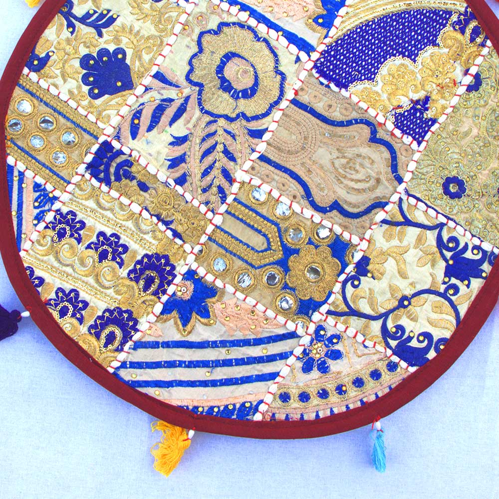 Discover the Stunning Multi Colour and Blue Barmer Round Table Runner – Exquisite Handcrafted Cotton Embroidered Patchwork with Floral and Leaf Designs. Featuring lush greens, intricate Rajasthani embroidery, and tassels for authentic boho elegance. View detailed images and embroidery/styling videos for inspiration. Shop now in our table runner category.