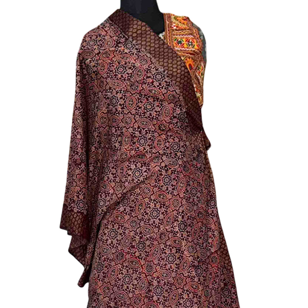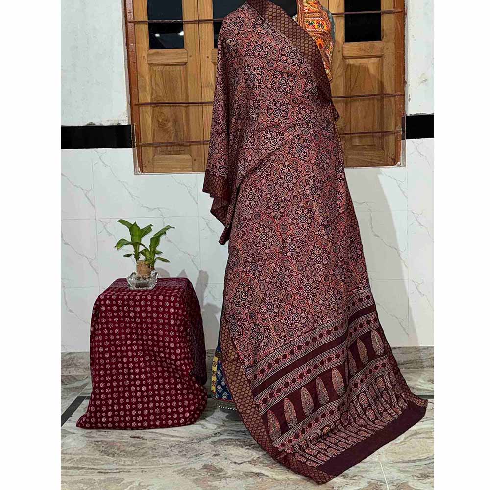 The Ajrakh dupatta radiates royal elegance in deep maroon. This luxurious Chanderi silk piece features authentic Ajrakh hand-block printing with intricate geometric and floral motifs, crafted using natural dyes for vibrant, long-lasting colors.
