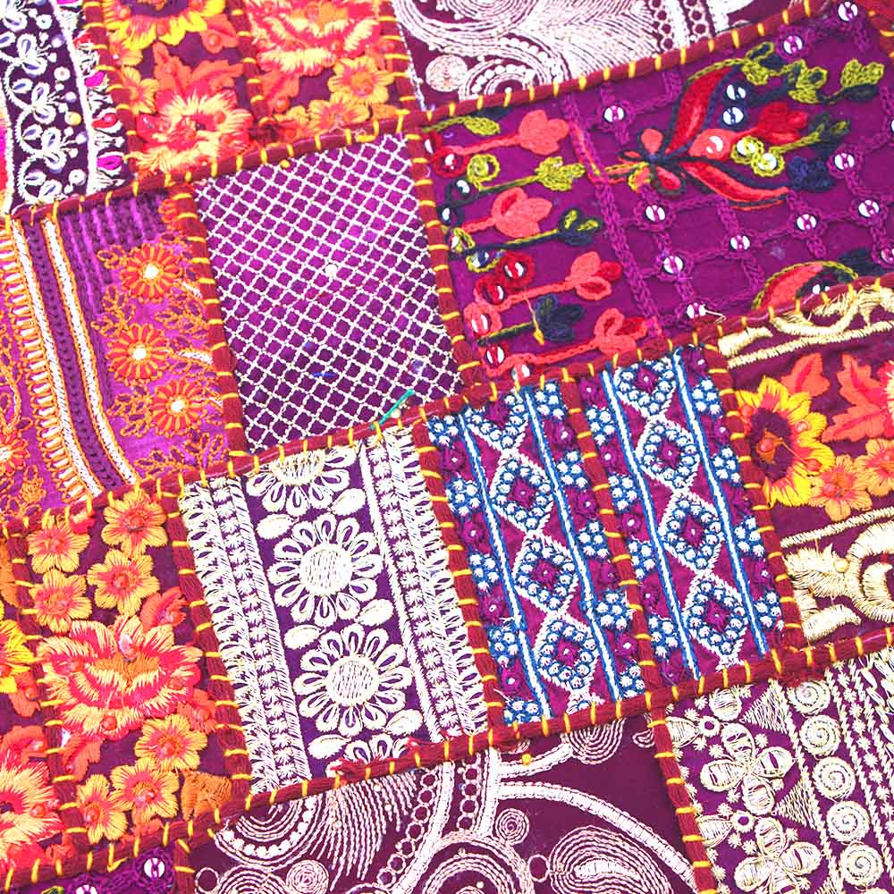 Opulent Multicolor and Maroon Barmer Round Table Runner – Exquisite Handcrafted Cotton Embroidered Patchwork with Floral and Leaf Designs