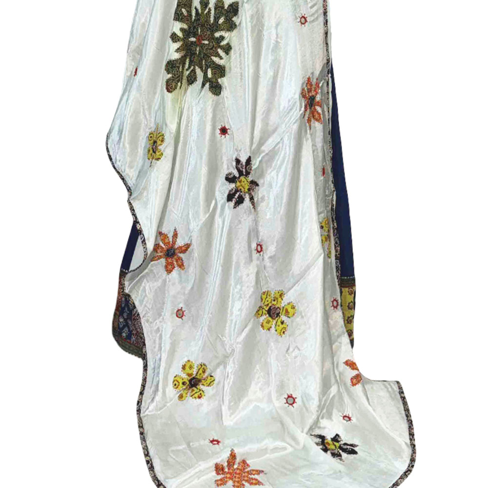 The mirror work dupatta holds you spellbound with every movement. This premium off-white modal silk piece mesmerizes through delicate hand-appliqued mirrors that dance with light, blending luxury fabric with timeless artisan craftsmanship.