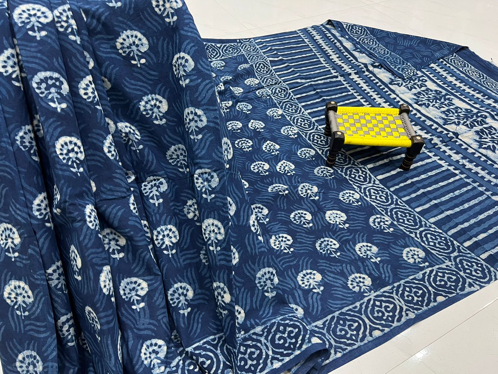 Today, malmal cotton remains prized for its breathability—perfect for India’s warm climate. The fabric drapes beautifully, feels gentle against the skin, and resists wrinkling better than ordinary cotton due to its long, silky fibers. In this exquisite navy blue Ajrakh saree, the malmal base enhances the richness of the navy blue dye while allowing intricate Ajrakh patterns to shine through with subtle sheen. Whether worn daily or for special occasions, this saree promises all-day comfort without compromising on style.