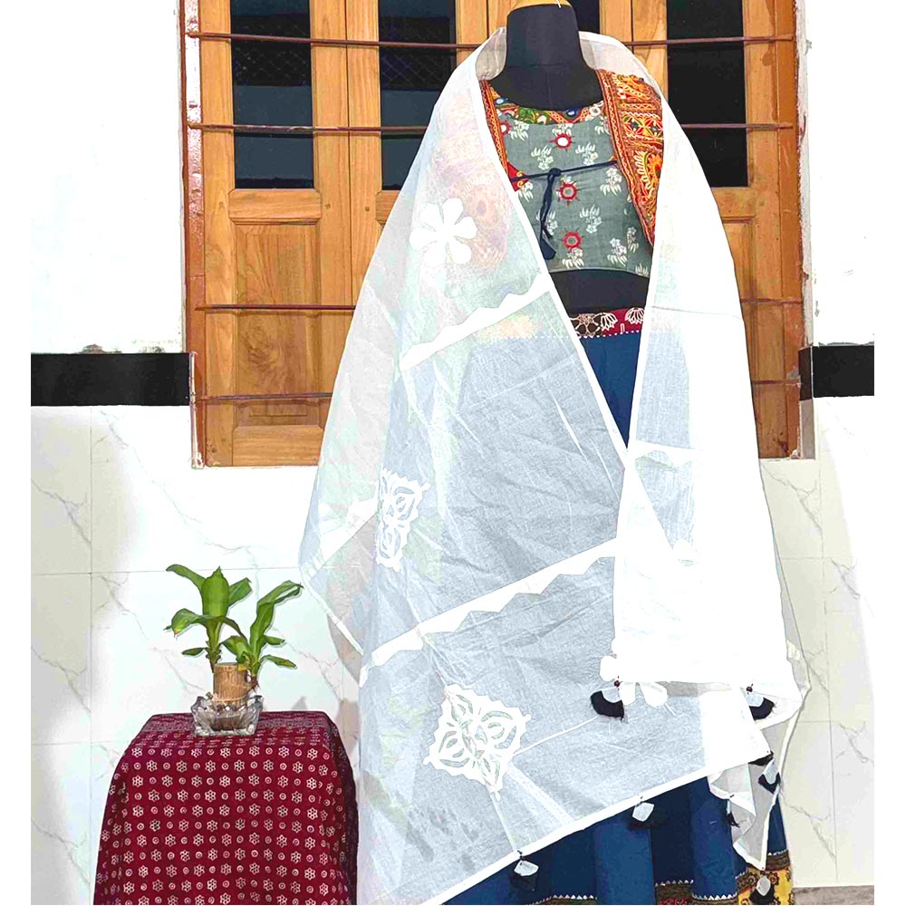 Grace your look with this elegant applique stole, featuring intricate hand-patch work and cut work on sheer organdy. Lightweight, textured, and artisan-crafted—perfect for layering, ethnic outfits, or formal elegance. Delicate handmade beauty!