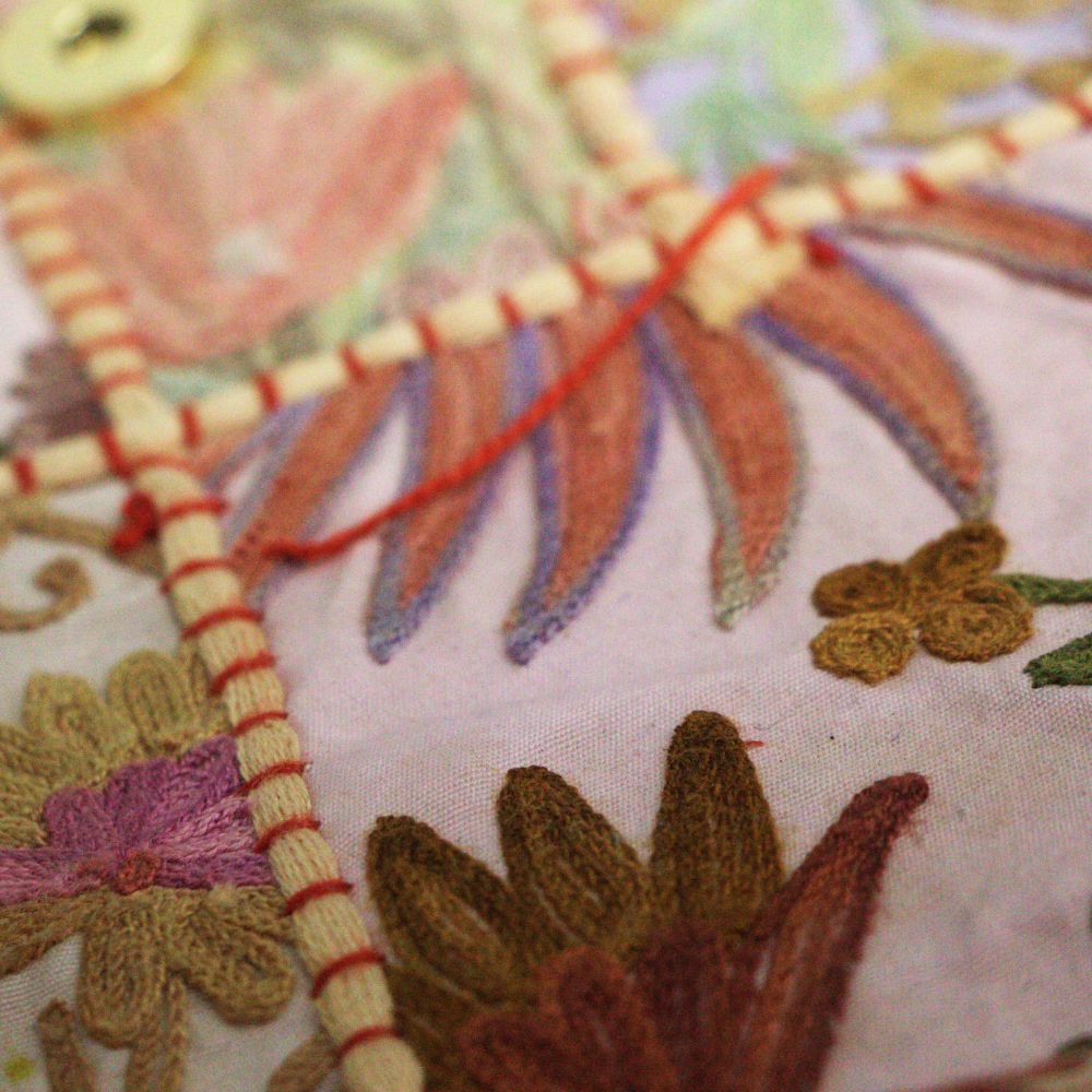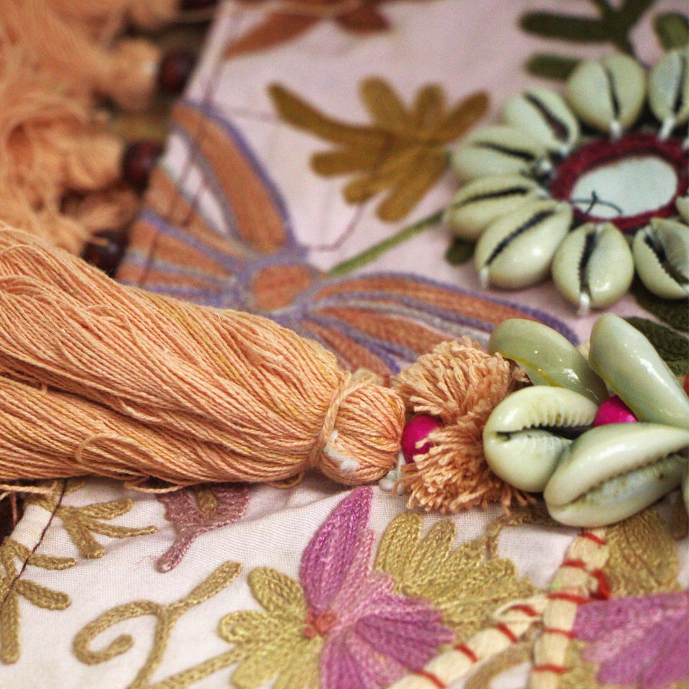 Material: Upcycled vintage fabric with embroidery & cowrie shells