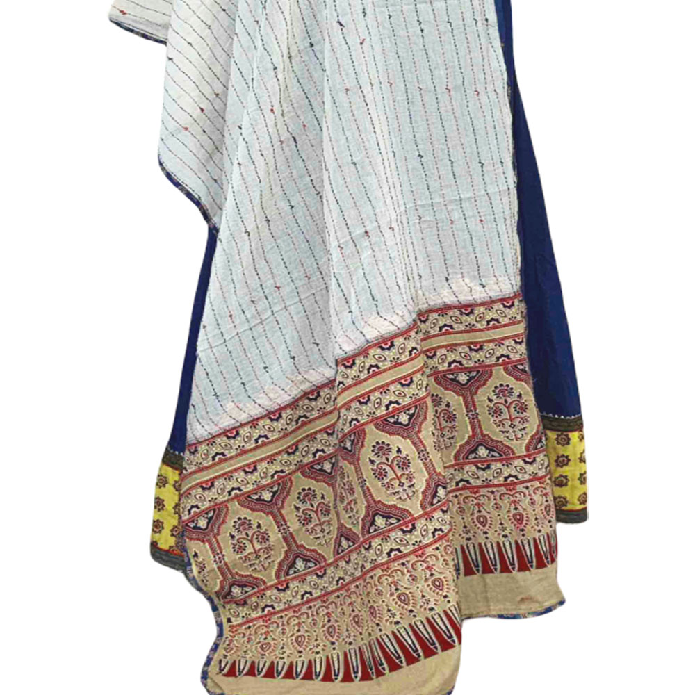 • Craftsmanship: Hand-Embroidery Katha Work + Traditional Ajrakh Block Printing on Palla