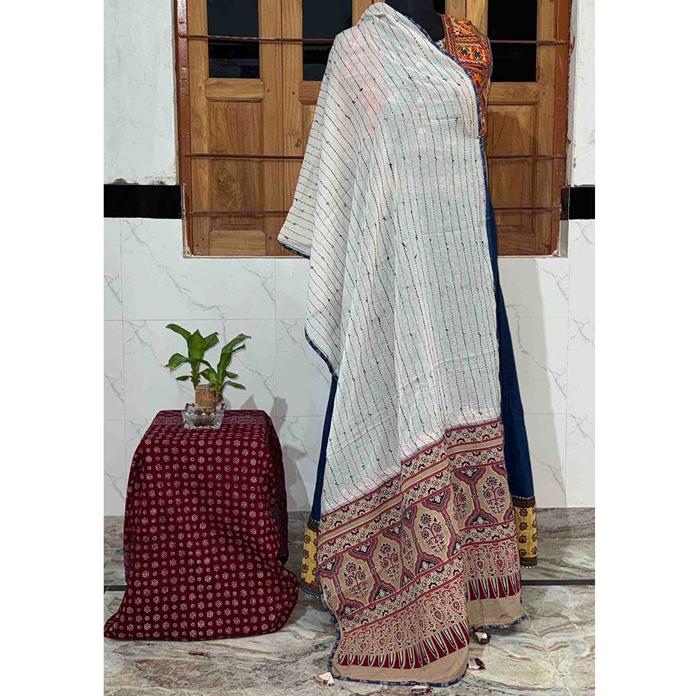 The Ajrakh dupatta captures the essence of timeless Indian craftsmanship. This beautiful off-white cotton piece features delicate Katha running stitches across the body and a richly detailed Ajrakh block-printed palla, handcrafted by skilled artisans using natural dyes and traditional techniques.